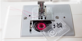 Simply drop your bobbin in the machine, pull your threads through the slot and let your machine do the rest.