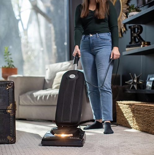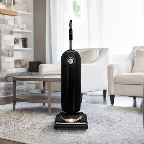 The R17 ultra-lightweight vacuum has nearly the same features as the SupraLite Premium but with a few extra benefits. Designed for today’s carpet styles and busy families the R17 has the soft carpet baseplate making it easy to vacuum ultra-plush carpeting without bogging down and being hard to push. In addition to a seven-year warranty this machine is eliglble for 17 service visits to your participating local Riccar retailer. Bring in your vacuum and have the belt and other critical features checked to make sure your R17 cleans reliably for many years. This model features a Hall sensor with lifetime belt which virtually eliminates down time due to broken belts. It’s light enough to carry up and down stairs and has a 40-foot power cord to clean room after room without stopping. Equipped with a self-sealing, charcoal-infused HEPA media bag to trap dust and dirt it also has rubber wheels and non-marking bumper a two-speed motor and a metal brushroll with replaceable brushstrips that can be customized for delicate floor types or rugs. Because most homes have at least some bare floors the R17 has a rubber squeegee that gently corrals dust and debris for easy removal.