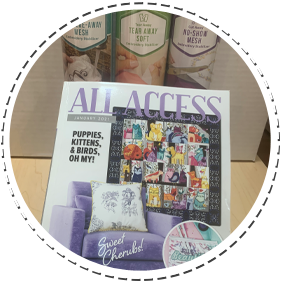 Dissolve Away Mesh 12” x 10 yards, No Show Mesh 12” x 10 yards, Tear Away Soft 12” x 10 yards, Anita Goodesign All Access Project Book and Embroidery Designs and 5 spools of Robinson Anton Embroidery thread.
